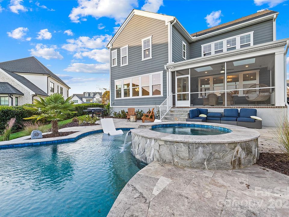 Step outside to discover your private retreat. A heated saltwater pool and spa serve as the centerpiece, framed by travertine decking that stays cool underfoot. A built-in basketball hoop offers fun and recreation, while the 12-foot by 18-foot screened porch with skylights, recessed lighting, and ceiling fan provides a multi-season space to relax, entertain, or dine alfresco. A dedicated gas line for grilling and lush landscaping create a secluded, resort-like setting that’s as beautiful as it is functional. JUST REMOVED THE TRAMPOLINE & ADDED 350 SQ FT OF SOD TO THE BACK YARD! Everyday convenience is enhanced by a flat driveway with an extra parking pad, making guest parking and play space a breeze.