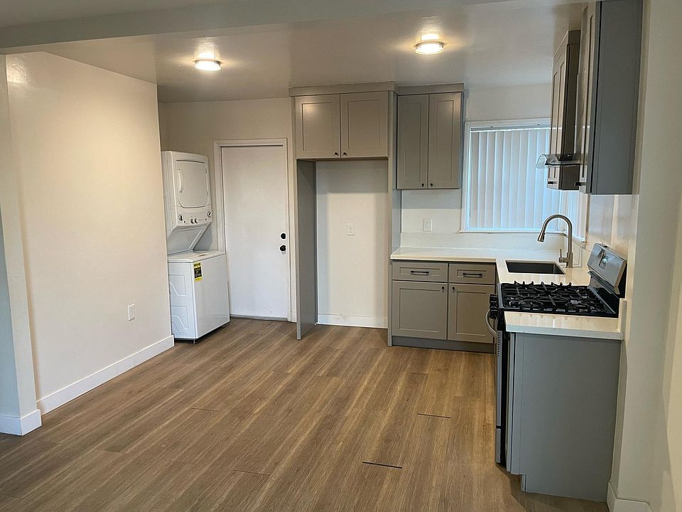 This recently remodeled apartment has an open floor plan and walk-in closet. This beautiful first floor unit has been remodeled from the ground up. New wood flooring throughout and completely remodeled bathroom and kitchen including new kitchen cabinets and quartz countertop. Comes with 1 detached garage parking space. Unit also has washer and dryer and gas range. Across the street from new park. Great for families. Must have good credit. Owner pays for trash, sewer and water. Tenant pays electricity, gas, cable, and internet.