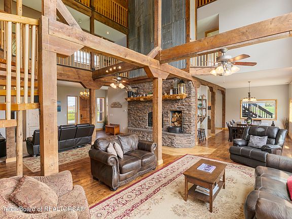 This remarkable property would make an idyllic family retreat, vacation get-away, or vacation rental, averaging $80K in rental revenue per year. Set on a sunny bluff with views of the Tetons as well as the Fall River, this 7-bedroom, 4-bathroom home with over 5400 square feet has plenty of space for hosting and entertaining large groups and for reunions of all kinds. The custom woodwork throughout the home is a must-see, including a 3-story spiral staircase and hand-finished original wood from a 1920 barn from this very site. The ceilings in the living room are 40 feet tall. The voluminous interior and abundance of natural light give the home a truly grand feel. There are decks on each floor as well as an irrigated lawn, providing copious outdoor space. This property is close to world-class fishing on the Henry's Fork and Fall Rivers (among others) as well endless recreational opportunites like hunting, skiing, hiking, mountain biking ...