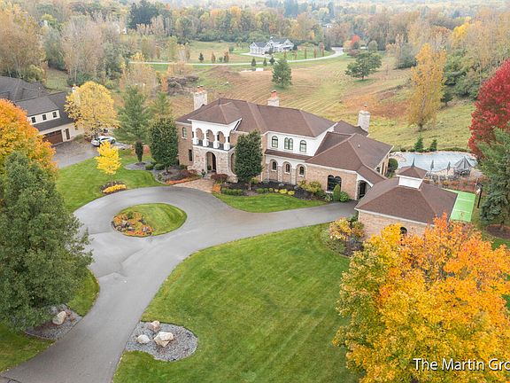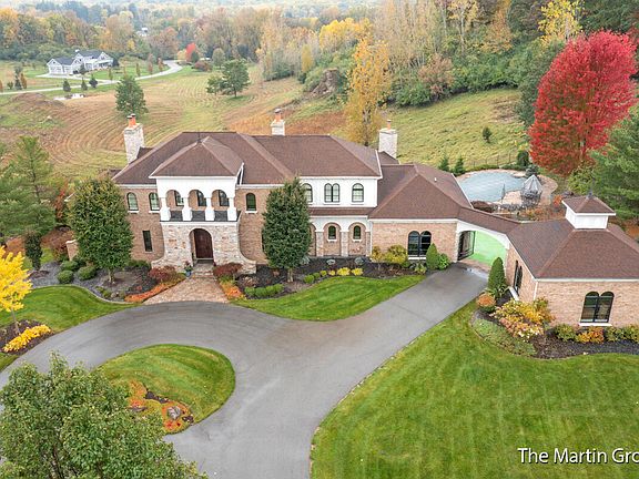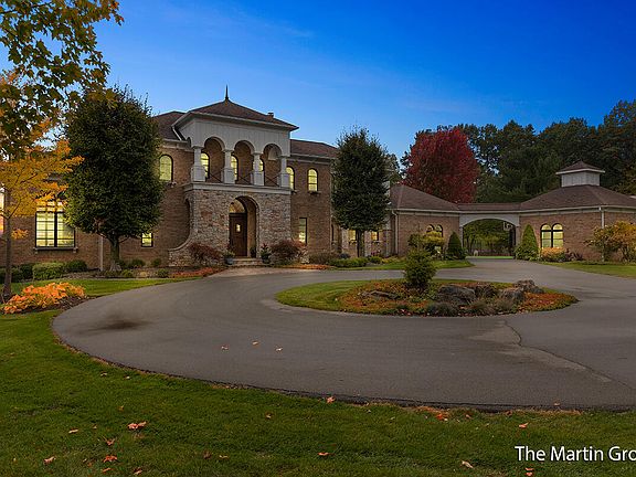 Step through the grand custom entrance and be captivated by the breathtaking vistas of the Grand River Valley through the expansive wall of windows before you. Every detail in constructing this home was executed without compromise, showcasing the commitment to quality and craftsmanship that pervades the entire home. Main floor, with natural stone flooring, complemented by an updated fireplace surround and elegant tray ceilings in both the living and dining rooms. Chef's kitchen, generous in size, boasts granite countertops, a substantial center island, ample cabinetry, and counter space. The two-way fireplace connects the kitchen and dining room and adds an extra touch of warmth and sophistication. The spacious covered porch features a charming wood ceiling, and is an ideal setting for entertaining while taking in the stunning panoramas. Upper level offers a primary suite that is generously proportioned, with a beautifully appointed bath and large walk-in closets. The layout includes a Jack & Jill bedroom and an additional ensuite bedroom. Lower level is equally impressive, offering a 5th bedroom, a family room and kitchenette, all with the same awe-inspiring views. An in-ground Spoelstra Pool, a dedicated sports area, and plenty of space to enjoy the beautiful surroundings. The design and quality of this residence are unparalleled, making it a point of pride for anyone fortunate enough to call it home!