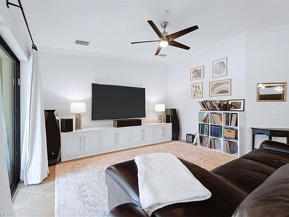 This social membership two-bedroom plus den, two bath features the Diangelo floor plan and includes an incredible and rarely available southern exposure view in the heart of Treviso Bay. Enter the top-floor residence through the spacious front screened Veranda to find extra-high ceilings and a unique blend of elegance and functionality. The wide-open floor plan of this popular model is ideal for entertaining and family living. The open concept flows from kitchen/breakfast nook to dining room and living room, creating one extra-large space. Accentuated by soaring ceilings and wide-line crown molding, it's ideal for hosting parties, movie nights and culinary adventures. Updated LED lighting fixtures and ceiling fans add a touch of contemporary style. For tech lovers, this condominium has been wired post-construction to support four rooms of in-ceiling speaker pairs and 15+ Cat6 data, security and wireless access point location drops, including the repainted and epoxy-coated detached garage. The den is a versatile space, featuring a queen-sized built-in Murphy bed with spacious storage for office supplies and linens and added crown molding, making it ideal for guests and a home office setup. Plus, enjoy the comfort of tastefully done wood-toned flooring in both bedrooms and the den. The kitchen features modern stainless steel GE appliances with a new dishwasher and tiled backsplash. The southern exposure fills the main living area with natural light all day long and the 24-by-12-inch tiled and super-screened back lanai provides a tranquil outdoor retreat where one can gaze at a pristine preserve, open skies and multiple lake water views. Don't miss your chance to own this exceptional condominium offering luxury, comfort and modern convenience in one of the sought-after Naples communities. Conveniently situated, a brief stroll leads to eight pickleball courts one way, and Villa Rilassare the other direction, which offers a host of elite amenities including a resort-style pool featuring cascading waterfalls, eight Har-Tru tennis courts with league play and pro instruction, poolside bar and dining options fully renovated March 2025, rejuvenating spa facilities, as well as tennis and bocce ball courts, elaborate fitness and aerobics facilities, saunas and steam rooms. World-class dining is enjoyed on the 18-hole TPC championship golf course grounds at the opulent clubhouse with an array of social activities on the calendar. Golf is available to social members of Treviso Bay from May to October. Ideally just five miles from vibrant downtown area of Olde Naples and in proximity to pristine beaches of Naples and Marco Island, this residence epitomizes sophisticated coastal living at its finest.