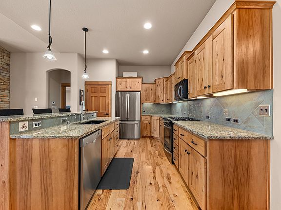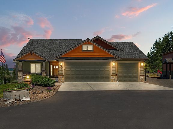 Enjoy privacy, space, and stunning Mt Spokane views from this 3BD+office/3BA 3,700 sq ft Paras-built craftsman rancher on 5 acres in Mead’s desirable Peone Prairie. Hickory floors, cathedral ceilings, and a floor-to-ceiling stone fireplace elevate the main level, complemented by granite counters and warm wood cabinetry. The flexible office easily converts to a 4th bedroom. The expansive primary suite offers thoseMt Spokane views, features double sinks, a soaking tub, walk-in shower, and oversized closet. Downstairs, a daylight walkout basement hosts 2 bedrooms, a bath, entertainment space, built-in bar, and patio access. Thoughtfully designed laundry includes a custom dog wash. Outdoors, relax on two covered decks, soak in the hot tub, or grow in the fenced garden. The 30x32 shop with RV-height doors offers ideal RV parking or toy storage. Wildlife abounds in this tranquil setting just minutes from the North-South Freeway, Spokane Valley, and North Spokane.
