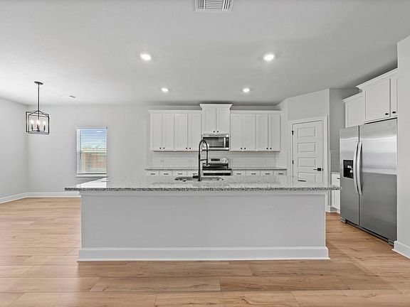 The Rainey is a spacious two-story home offering approximately 2,198?sq?ft of thoughtfully crafted living space including 4 bedrooms and 2.5 bathrooms. Inside, you'll discover an open family room, inviting dining area, and chef-ready kitchen boasting stainless steel appliances, granite countertops, 42 inch upper cabinets with crown molding, a sprawling island, and luxury vinyl plank flooring—all designer upgrades included as standard. The second floor houses a sprawling master suite with dual walk-in closets and a private spa-inspired bath, alongside three generous secondary bedrooms, ample linen closets, and a dedicated laundry room to maximize convenience and storage. Outside, enjoy a covered front porch, back patio, and professionally landscaped front yard for curb appeal and outdoor relaxation. As part of Whisper Valley’s signature EcoSmart Solution community, this home comes with a 220 volt outlet for a future electric vehicle charger or hot tub, and includes geothermal HVAC, rooftop solar panels, spray foam insulation, and high-speed Google Fiber —designed for comfort, sustainability, and future-ready living.