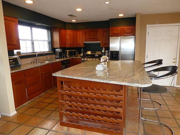 **Gorgeous Updated Townhouse**Only shares garage wall! Spacious open floorplan w/raised ceiling in main living area, 3 skylights & 2 ceiling fans. Entertainers dream kitchen remodel w/large granite island, cherry cabinets, stainless appliances/fixtures & wine fridge! Open Kitchen design w/adjoining dining area. Custom recessed lighting and gas log kiva FP add to the charming ambiance. Updated large master w/dbl sink, cherry vanity, built-in cabinet/entertainment center & walk-in closet. Saltillo tile in kitchen and baths. Main living area and master flow out to east side patio.
