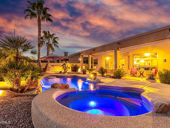 The backyard is a delight with spectacular Sonoran Desert open space and privacy. Large pebbletec pool and spa, waterfall scuppers finished with stacked stone, wood burning fire pit and pizza oven, outdoor kitchen with large island space is perfect for entertaining.