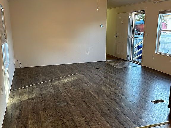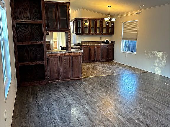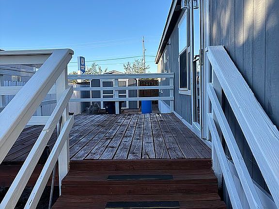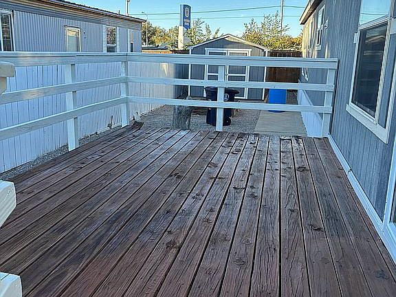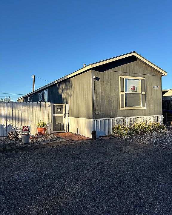 This charming 2016 3 bedroom/2 bath Solitaire mobile home is situated in the well-established Van Cleave Place community in SE Albuquerque. Offering both comfort and convenience, the home comes equipped with like-new GE appliances, including a spacious washer and dryer, refrigerator, and a refrigerated AC unit. You'll also appreciate the large treated wood deck, perfect for outdoor relaxation. Inside, there is an abundance of storage space, featuring generous cabinetry, a dedicated laundry room, and a roomy shed in the yard. The property is fully fenced and graveled, ensuring both privacy and security. With driveway parking that accommodates up to three vehicles, you'll enjoy easy access and ample space. The lot rent is approximately $573 per month, which includes water, sewer, and trash services.