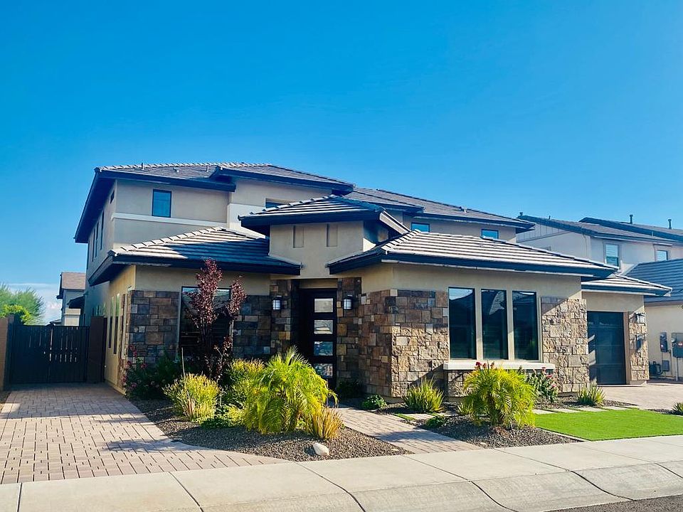 Upgraded SOLAR home with designer touches.Entry has a covered courtyard and open space, there is a formal living, formal dining, Great room and huge kitchen. Soaring 2 story foyer with beautiful open staircase. tile in the main living area dining and kitchen. Upgraded kitchen cabinets and appliances, gas cooktop, tile backsplash, large island with Granite countertops. Upstairs has a loft/game room and 3 bedrooms. Downstairs and upstairs Master bedroom has large walk-in closet, Master bath has his/her vanities and a super shower. Garage storage cabinets, sink, tankless water heater & water softener. HUGE Backyard is landscaped with artificial grass, paver seating, Ramada! Save on utility bill, owners pays no electric with SOLAR No Smoking allowed, pets lessor approval required