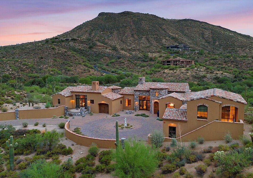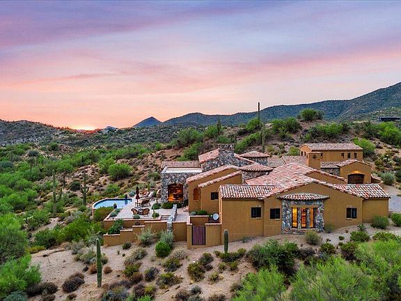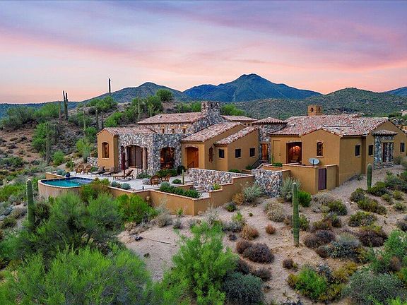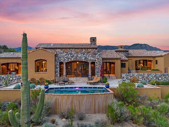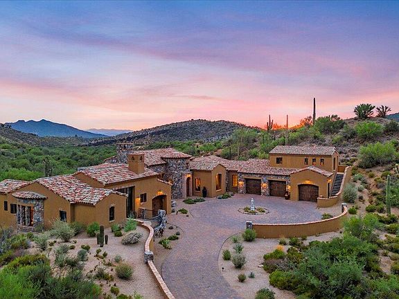 LIFESTYLE MEMBERSHIP AVAILABLE. Exquisite 2.2 acre Desert Mountain estate welcomes you with its brick lined circular driveway, old world feel and panoramic mountain views that do not stop! Elegance abounds with the extensive use of marble and stone finishes throughout, granite countertops, gorgeous tile flooring and well appointed bathrooms! The kitchen is an absolute DREAM and features a gas cooktop, double wall ovens and a wet bar with a pass through to one of the FIVE outdoor patios (one is screened in)! There are 3 bedrooms with ensuite baths in the main home, with a bedroom, bath and kitchen in the private 545 sq. ft. casita with separate entrance! Let the views of the Sonoran desert and stunning sunsets melt away your stress while soaking in the sparkling pool or spa!