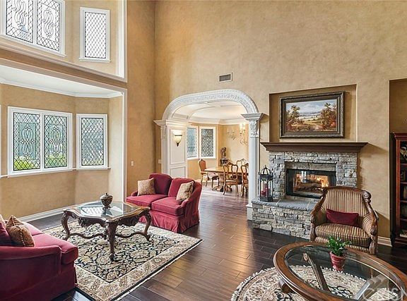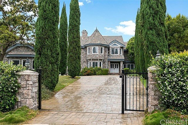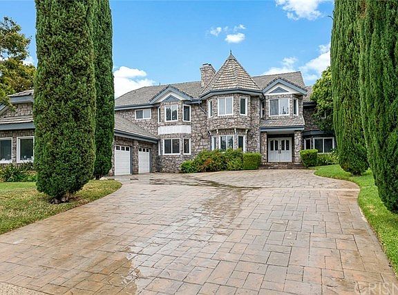 A new price for this Aabsolutely exquisite, customized two-story pool home situated behind its own gate in west Chatsworth is on the market for the first time in 18 years. Double doors and leaded glass windows greet the visitor as they walk across the stamped concrete driveway. Volume ceilings, a wood burning dual sided fireplace, engineered wood floors, wrought iron railings, ornate crown moldings in the formal dining room and trim around the archway are but a few of the features upon view once inside the home. A wet bar, family room with a gas dual sided fireplace, plantation shutters, and breakfast area are located on the backside of the house with views of the pool, spa, and fountain. The chef's kitchen is replete with granite counter tops, Viking six-burner range, Monogram side-by-side refrigerator/freezer, microwave, stainless steel dishwasher and beautiful center island. A den is featured on the south side of the house while the office/fifth bedroom is located on the first floor, as well. Upstairs a spacious master bedroom with two walk-in closets, spa tub, bidet, volume ceilings, sauna and fireplace complete this romantic motif. One upstairs bedroom comes with its own ensuite bathroom while the other two bedrooms share a Jack and Jill set-up for their bathrooms.
