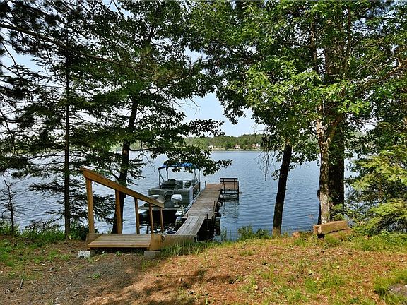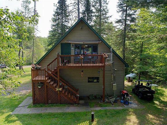 This charming cabin is situated on the east shore of Upper St. Croix Lake. The very private, heavily wooded site offers 12.9 acres and 204' of frontage with westerly exposure and gentle slope to water's edge. The cabin was built in 2004 just the way the owner's envisioned it keeping minimal maintenance and functionality in mind. The main level features two spacious bedrooms, a half bath, laundry, mechanicals, and workshop. The upper level has been tastefully finished with knotty pine and offers a full kitchen, bath, bedroom, and a lake facing living room that you will be sure to enjoy! Spend your mornings and evenings on the deck taking in the stunning elevated views of lake. Overall, a great up north cabin feel with all of the modern amenities but room for expansion if desired. Sand frontage offers great swimming. Trails throughout land. Property is being sold fully furnished and also includes pontoon&motor, and a portable ice shack! You will be completely set for the lake lifestyle!
