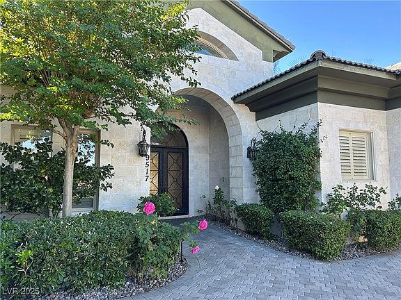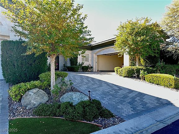 This elegant single-level home rests within prestigious guard-gated Queensridge. Behind its white-marble facade and custom steel-and-glass doors are interiors with 12-foot ceilings, marble flooring, and refined stone accents.