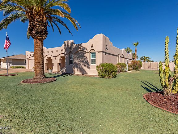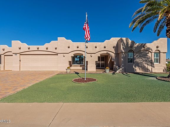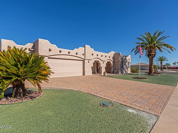 Welcome to this bright and spacious 2-bedroom, 2-bathroom Sun City gem. Just added NEW CARPET, NEW PAINT, NEW APPLIANCES!!!! Large corner lot, enough room for a shop or an additional garage in rear. The open floor plan showcases a large kitchen with a central island, seamlessly flowing into a generous great room, ideal for entertaining and relaxed living. Step into the enclosed Arizona room, or enjoy the dedicated office space for work or hobbies. Outside, a stunning backyard awaits with beautiful desert landscaping that creates a serene, low-maintenance oasis. Golf Cart Garage! Outfitted with new shutters and a fantastic solar lease with low payments. New refrigerator and dishwasher! Located just minutes from all the amenities and activities that make Sun City has to offer.