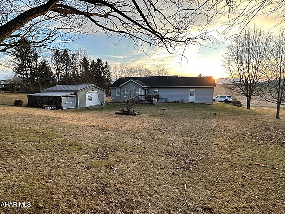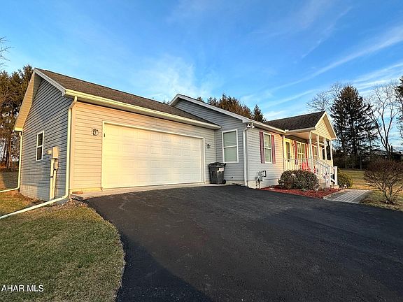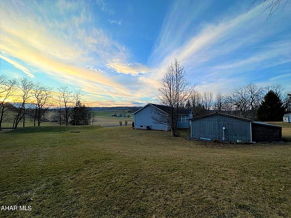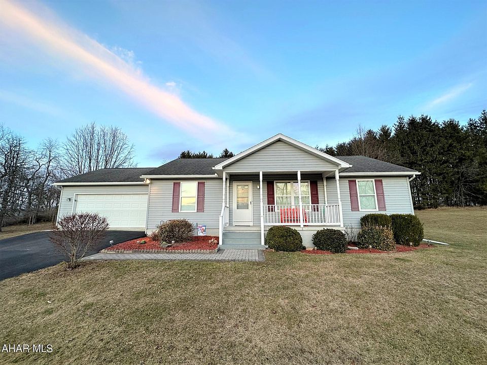 Charming ranch home with beautiful country views!! This home was built in 2005 and offers a living room, kitchen, dining area, owner's suite bedroom w/ full bath, two additional bedrooms, another full bath, laundry room and a cozy finished sunroom that's perfect for relaxation. Full basement with concrete walls, walk-out door, private well and private sewer. NATURAL GAS forced air heat, central air-conditioning and 200-amp electric. Two-car attached garage, storage shed, and a one car detached garage that is insulated, has a pellet stove and used as a workshop. Black-top driveway and a spacious yard. Peaceful country setting but centrally located to major roads and amenities. Sit back and enjoy those scenic sunsets on your front porch!!