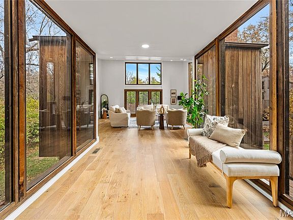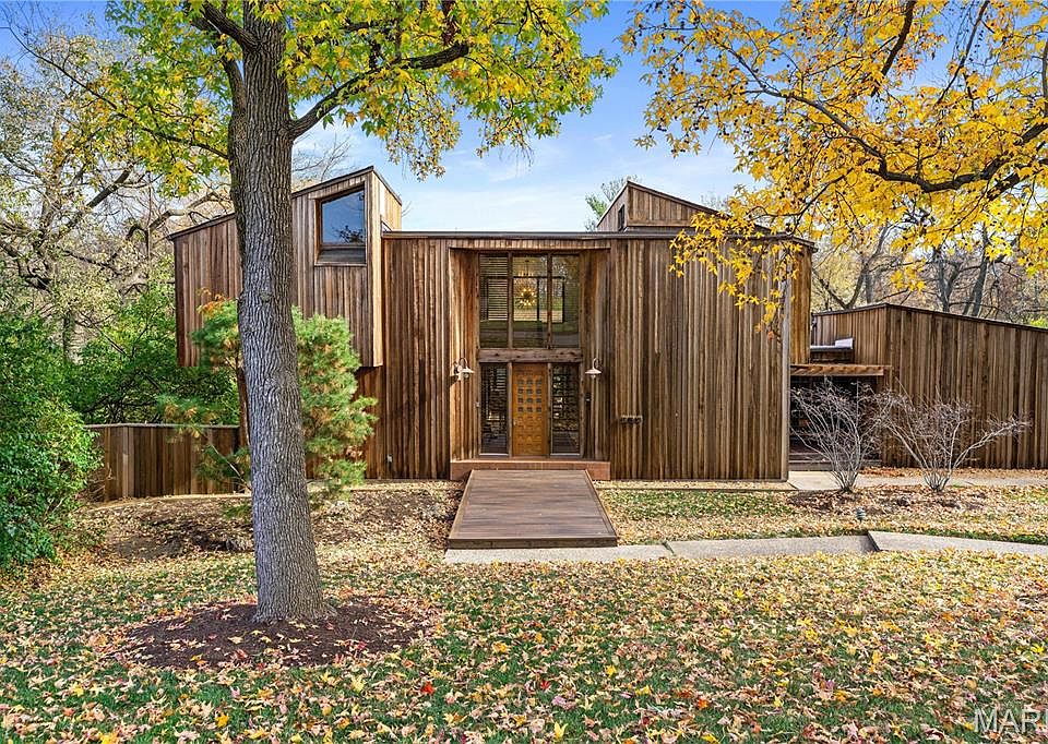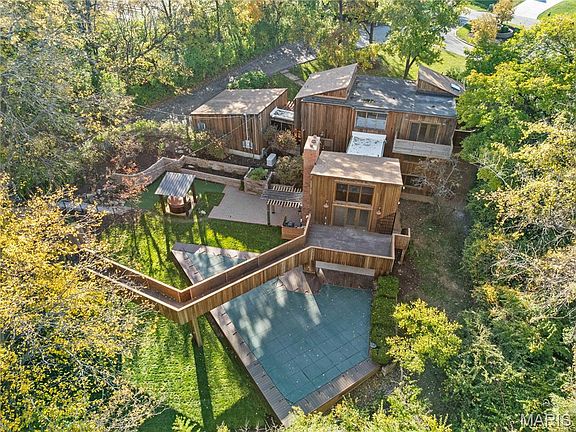 This redwood-clad contemporary, designed by architect Charles E. Fleming as his own modern sanctuary, radiates coolness! Completely renovated yet true to its original spirit, the home seamlessly connects to nature through walls of windows and outdoor spaces that make the private 1.12-acre setting feel like a modern treehouse retreat. A dramatic two-story foyer opens to a warm, tree-lined living room with a fireplace and deck access. The reimagined kitchen pairs a large island with sleek oak cabinetry, stainless steel appliances, and a butler's pantry. Another large flexible space at the front of the home would make a perfect formal dining room and living room. Upstairs, the light-filled primary suite features a skylit bath and a walk-in closet with built-in storage. Two additional bedrooms and a bathroom complete the second level. The original spiral staircase leads to a walkout lower level featuring a recreation room with a bar, a bedroom, a bath, and a laundry room with a dog wash. Walkout access leads to the covered patio with a fireplace that steps out to the pool, hot tub, and putting green. A bridge leads you over the pool to the guest house apartment, which includes a sauna, kitchenette, circular dome window, and a two-car garage. Another bridge in the yard takes you to an almost secret flat lot. An additional two-car garage is attached to the main house.
