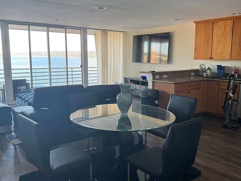 This fully furnished top-floor condo looks right out over Lake Washington, and you can take it all in from your living room as well as your private balcony. The kitchen includes granite counters, stainless steel appliances, microwave and all the necessary cookware, dishes and kitchen tools. One bedroom has a queen bed and the other has a full size futon and twin size futon. Perfect if you need a flexible room for kids, guests or home office. In-unit washer and dryer.