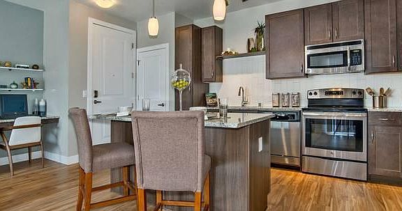 Elegant kitchens and bathrooms feature upscale appliances, fixtures and finishes such as Moen faucets, granite countertops, tile backsplash and premium wood cabinetry and stainless steel appliances. Experience the open, airy feeling that condominium-like design brings, complete with an abundance of windows, nine-foot ceilings, and eight-foot sliders. Spacious balconies and patios extend your living space to the outdoors. Beautiful hardwood-style plank flooring extends throughout the main living areas and bathrooms, with luxury carpeting in bedrooms. Bedrooms feature luxury carpeting and spacious walk-in closets. The full-sized washer and dryer in your home are energy-efficient, as are your kitchen appliances and heating/air-conditioning. Workout center and a pool with grills available poolside. Patio attached to unit. Underground parking-unit comes with one spot.