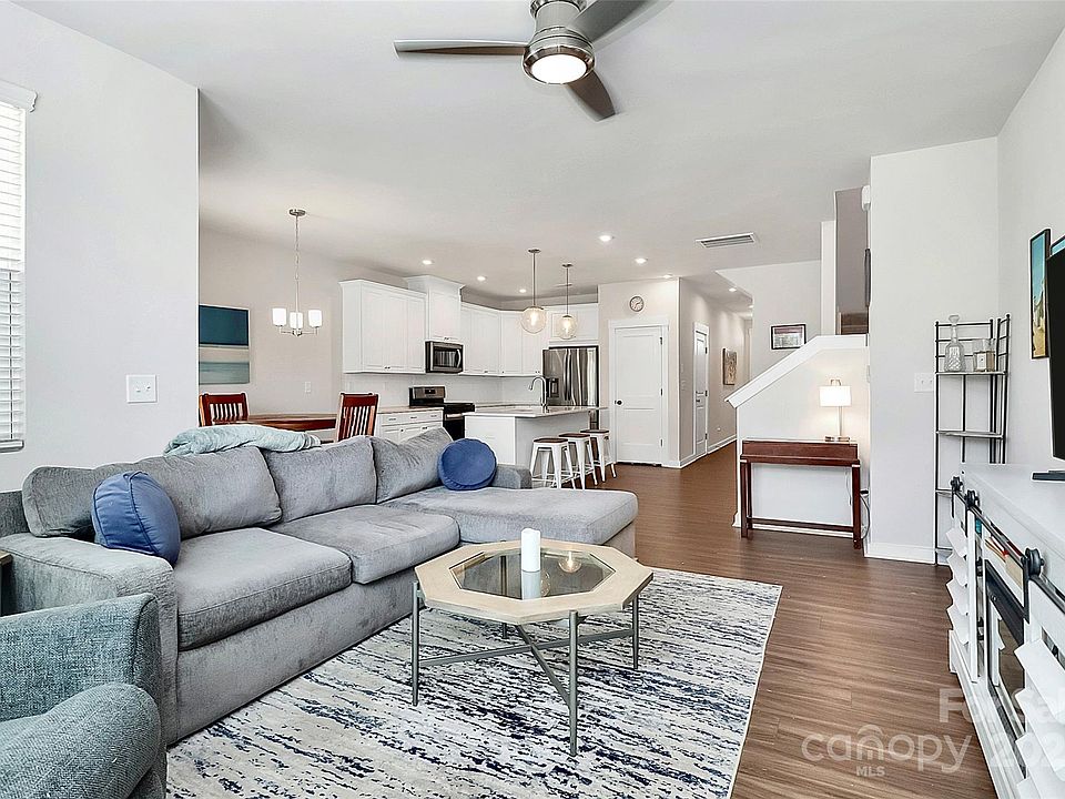 Spacious, upgraded, like-new townhome in the amenity-rich Griffith Lakes community, conveniently located across from Davis Lake Shopping Center, and directly between 77 and 85! With dog park, playground, and access to Griffith Lake, you can live an outdoorsy lifestyle while enjoying a spacious home. A Wylie Elite model, 9521 Munsing Dr. features bonus office/flex space on the first floor, top-end Toll Brothers trim package (which you'll see in the countertops, pendant lights, and appliances), custom blinds, screen door, and ceiling fans installed, and a third-floor loft with a full bathroom that could become a guest suite or fourth bedroom...or an awesome media room, playroom, or gameroom! The open concept on the main level is bright and airy with 10-foot ceilings, and the second story boasts a spacious primary suite, walk-in laundry room, and two additional generous bedrooms.