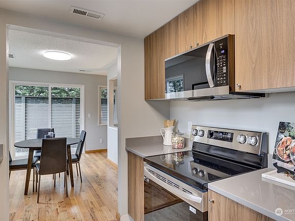 This ground-floor gem combines comfort and style in the desirable Downtown Bothell area! Enjoy preparing meals in your newly updated kitchen with sleek quartz countertops and brand new stainless steel appliances or explore a diverse array of restaurants, cafes, and eateries just steps away! Oak hardwood floors and a cozy fireplace make it perfect for relaxing evenings or entertaining guests. Large windows allow in natural light, highlighting modern design elements throughout. Both bedrooms offer additional large windows and ample space and storage. Outside, you'll find a charming fenced patio area adjacent to the units assigned parking space. Plus, take advantage of the nearby parks, shops, and entertainment options. Welcome home!