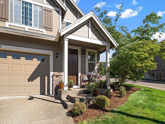 Situated on a sunny corner lot in the highly desirable, Arbor Vista neighborhood, this impeccably maintained home combines timeless style with modern comfort. The heart of the home is its spacious kitchen and living area—perfect for both everyday life and entertaining. The gourmet kitchen features solid wood cabinetry, stainless steel appliances, granite countertops, a convenient eating island and a gas range. The open concept living area is anchored by a cozy gas fireplace that is surrounded by thoughtful built-ins and a spacious dining area. Just off the dining room, a thoughtfully designed patio offers year-round enjoyment, framed by mature landscaping that showcases the beauty of every season. Whether you're hosting friends or enjoying quiet time alone, the patio offers a seamless extension of your living space.Upstairs, you will find three generous bedrooms, including a serene primary suite with soaking tub, a large walk-in closet, and a conveniently located laundry room. This move-in-ready home is ideally located just steps from Roger Tilbury Memorial Park and minutes from Intel, Nike, and downtown Portland.