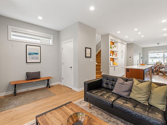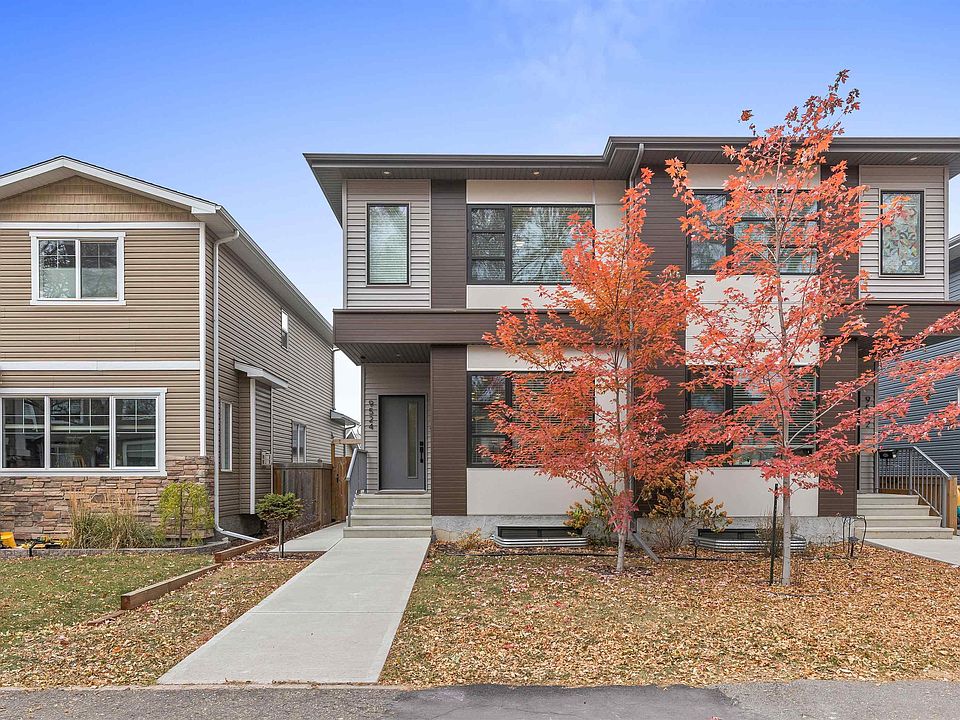 EXPERIENCE MODERN ARCHITECTURE. Thoughtfully styled and expertly crafted, this one-of-a-kind home displays a level of design, construction and attention to detail not found in any other RITCHIE infill. Blanketed with vinyl plank flooring on all 3 levels, the interior showcases a gourmet kitchen with dual-toned custom cabinetry & a 10’ kitchen island, quartz countertops, upgraded light fixtures, and a tiled feature wall with a linear electric fireplace. Featuring over 1400 sq.ft with 4 Bedrooms & 3.5 bathrooms, plus a finished basement with a wet bar, customized closet organizers throughout, 9’ main floor ceiling, upper floor laundry, and CENTRAL AIR CONDITIONING. Complete with a rear composite deck, concrete walkway, full landscaping and a double heated garage. Located a block away from the MILLCREEK RAVINE TRAIL SYSTEMS, the Four Corners Market, and just minutes to the U of A and the downtown core. A RARE FIND.