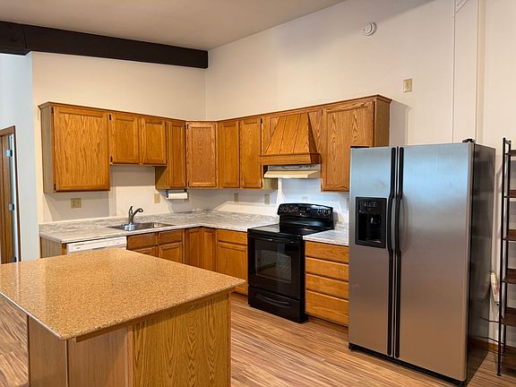 Kitchen equipped with refrigerator, stove, dishwasher, and washer/dryer