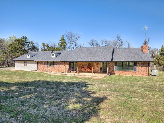 This property is truly one of a kind! Completely remodeled top to bottom on secluded, wooded, 6.8 acres in Mustang! The spacious home, workshop, and pole barn are situated down a private driveway, making this a quiet oasis, giving the feeling of being far from town while keeping the convenience of prime location and proximity to all necessities! Totally updated inside with classy modern finishes! All new windows, appliances, counter tops, cabinets, showers, dual unit air conditioner, furnace, water heater, and so much more. Class 4 Impact resistance roof installed 2023. The property is adjacent to a spring fed creek and the front three acres are fenced pasture for all of your homestead ideas. The 3 car garage includes a mudroom which has a spacious storm cellar. No restrictions/HOA. Come see why this piece of paradise could be the perfect place for you to call home!