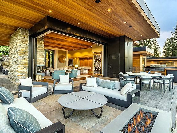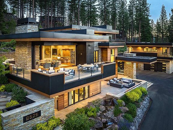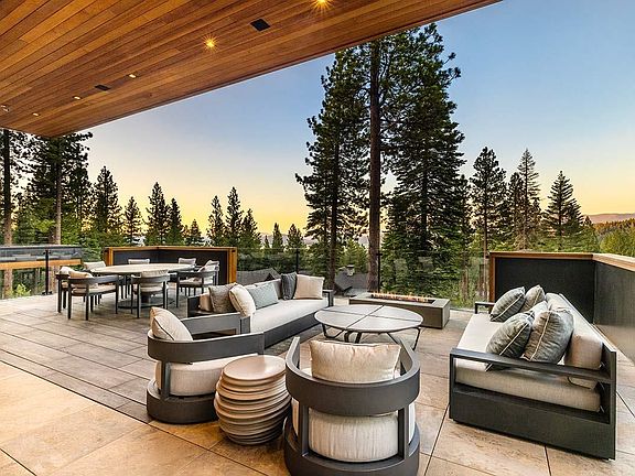 The first order of business after entering this 8,198-square-foot Martis Camp estate is simple: open a thesaurus. Words will be hard to come by, especially when one’s jaw is permanently dropped. Although words may be hard to come by, conversation and gathering will be plentiful in this entertainer’s dream home, especially where the kitchen, great room, dining room, patio and decks converge. Here, to the left and right of a 72” long fireplace that anchors the great room, are ceiling-high pocket doors that slide out of sight, revealing views of Martis Valley and Carson Range beyond the north deck and a back deck that nestles into the hillside to the south with views of Lookout Mountain. From all points of this area — kitchen, great room and dining room — the scene can shift from warm, intimate and enclosed one moment to “one with nature” the next as the line between indoor and out is tucked away. Even the corners of these walls of window disappear. It’s an entertainer’s dream, regardless of the size of the party. The kitchen is graced by a wine cellar whose 409-bottles are on full display. Tying this three-level home together is a glass elevator with stunning views and a series of graceful, floating staircases that lead to 7 bathrooms and 7.5 bedrooms, including a primary suite with pocket doors, fireplace, deck and a stunning no-touch steam shower with floating benches. This suite has its own private access to the massive gym situated above the connected two-car garage. Bookending this home are a pair of creeks – one off the back patio near the hot tub and the other near the entry — that provide a soothing soundtrack to complement the setting. Walnut floors run the course of the home while doors, trim and cabinets are white oak. Countertops are granite and the decks feature floating porcelain tiles that secret water away from the surface, along with two fireplaces where guests and family can gather. Location is the final trump card this home holds: for one, it’s nicely elevated above the end of a cul-de-sac; secondly, it’s situated in sight of Lookout Mountain above, in the event that, — for some reason — you’re compelled to step away from this home’s endless attractions and head to the ski slopes.