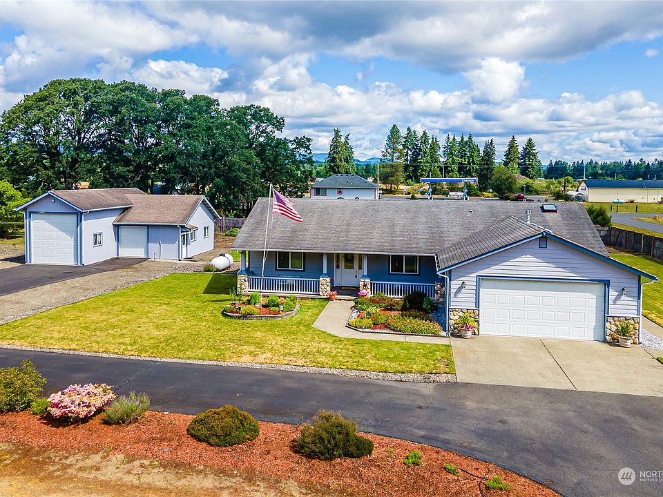 Wonderful Rambler with fabulous shop & extra garage on .86 acres! Charming home features a desirable split floorplan with spacious Primary Ste, 5-pc bath & w/i closet on one end & 2 add'l BRs & 2nd full bath on the other. Vaulted ceiling, skylights & lg windows offer great natural light. Kitchen boasts lg pantry, abundant cabinetry & counterspace, bar seating & nook w/door to covered patio, perfect for entertaining! Living Rm w/cozy gas FP open to Kitchen & sizable Dining Rm. 940 sf Shop & Garage allow you to park your RV, Boat, Toys AND enjoy hobbies! Relax in the peaceful backyard w/mature landscaping & garden area. HP A/C, Sprinkler System & all appliances convey! Just minutes to I-5, shopping & Rochester schools. This is the sweet life!