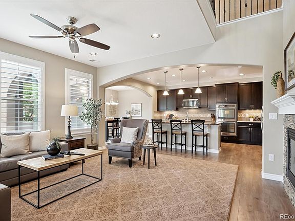 Refined townhome living in the heart of Highlands Ranch’s sought-after Tresana community! Tucked away on a quiet cul-de-sac, this thoughtfully designed Bozzetto model offers rare mountain views from the primary suite’s private balcony. The kitchen is a true focal point, showcasing maple cabinetry with soft-close drawers, a stunning granite island, quartz counters, custom backsplash, and stainless steel appliances including a gas cooktop and double ovens. The living room invites relaxation with its corner windows, gas fireplace, and elegant plantation shutters. The main floor was uniquely upgraded to include a three-quarter bathroom off of the main floor bedroom so that each bedroom has it's own bathroom. Premium carpet, installed in 2021, remains in pristine condition throughout the upper level, where you'll find the spacious primary suite, an additional bedroom with its own bath, a well-appointed laundry room, and a bright, built-in loft space perfect for a home office with floor-to-ceiling bookshelves. Other upgrades include designer lighting, custom window treatments, an epoxy-finished garage with built-in storage, and high-end bathroom finishes. Enjoy access to Highlands Ranch's scenic trails, parks, four rec centers plus close proximity to C-470, premium shopping and dinning!