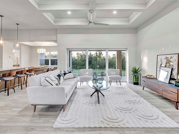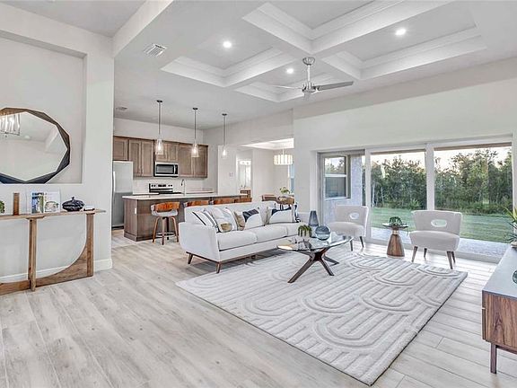 Brand New Move-In Ready Home! Introducing the Turnberry DX model by the award-winning Harbor Home Builders. This beautifully crafted 3-bedroom, 2-bathroom, 3-car garage home welcomes you with a grand 12-foot entryway and elegant coffered ceilings. Enjoy luxury finishes throughout, including impact windows, porcelain plank flooring, solid wood cabinetry with soft-close doors and drawers, quartz countertops, and designer lighting and fans. The spacious primary suite features a tray ceiling with ambient lighting, a transom window, a generous walk-in closet, and an additional storage closet. The primary bath offers dual vanities and a stunning tiled walk-in shower. Step outside to the expansive 27' x 9' lanai, complete with an entertainment wall featuring electrical outlets and provisions for an outdoor kitchen — perfect for relaxing or entertaining. Don’t miss your chance to own this exceptional new home. Schedule your private showing today!