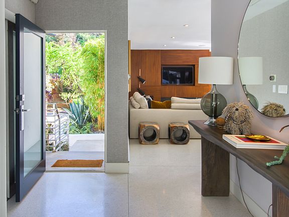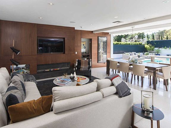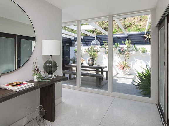 This classic, gated mid-century modern home in prime BHPO has been stunningly reimagined, fusing modern touches with enduring architectural appeal. Cradled in a serene canyon setting, doors open to a light-infused great room with poured terrazzo floors, a custom walnut wall with fireplace, disappearing TV panel, and Fleetwood sliders that open to the resort-like pool. The great room spills into a chef's kitchen with custom walnut cabinets, a center island, stainless steel appliances and wet bar with 150-bottle wine fridge. A dining patio off the kitchen, complete with a living art wall, is accessible through Fleetwood doors. The master suite features an elegant bathroom with a spa tub, dual sinks and walk-in closets. Sliding walls of glass fuse the space with the pool terrace, which features a built-in Wolf grill and ample space for entertaining. This ultra-private Beverly Hills home transitions from intimate canyon hideaway to sophisticated poolside retreat with the slide of a door.