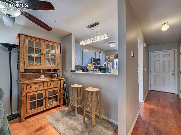 Well-maintained, move-in ready 2-story townhome offering 1,088 sq. ft. of thoughtfully designed living space in the desirable Brant Hollow neighborhood. Enjoy a covered front balcony overlooking open space with stunning mountain views, perfect for relaxing outdoors. Inside, the open main-level floor plan features attractive wood laminate flooring throughout the Living Room, Dining Area, and Kitchen. A convenient Powder Bath off the entry is ideal for guests. The Kitchen boasts a breakfast bar, ample cabinets, generous counter space, and stainless steel appliances—including a dishwasher, range oven, built-in microwave, and French door refrigerator. The Dining Area sits between the Kitchen and Living Room, creating a natural flow for entertaining. Cozy up by the gas fireplace with stone surround in the Living Room or step out to the private concrete patio for outdoor enjoyment. Upstairs, you’ll find a laundry closet with washer and dryer included, plus two spacious bedrooms with lighted ceiling fans and neutral carpet. Each bedroom has its own full bathroom featuring a vanity, framed mirror, and tub/shower combo. Additional highlights include: a newer furnace and central air/heat for year-round comfort. Oversized, deep 1-car attached garage with opener, storage space, and direct home access Plenty of guest parking nearby. Ideally located close to schools, parks, trails, dining, and shopping along the Powers Corridor, with an easy commute to Peterson Space Force Base, the U.S. Air Force Academy, and Fort Carson. Don’t miss your chance to own this delightful townhome with incredible views and a prime location—schedule your showing today!