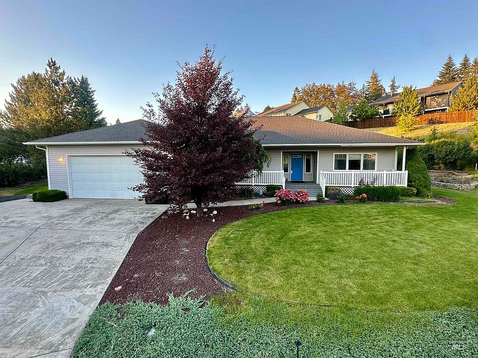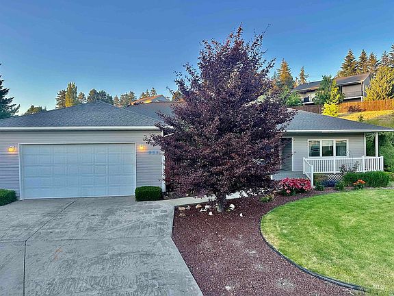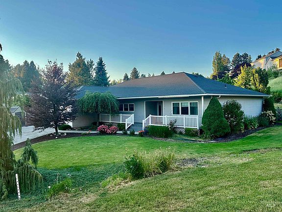 With Moscow’s lack of single level homes, this is a rare find, set on a spacious 1/3 acre lot nestled in a peaceful cul-de-sac, with incredible surrounding property values. Covered porches in the front and back. Immaculate landscaping. The open floor plan is highlighted by large picture windows and abundant natural light. Vaulted ceilings create a sense of openness, seamlessly connecting each space. Move effortlessly from the island in the roomy kitchen to the formal dining room, adjacent living room, and out to the private covered back patio—ideal for entertaining.With four generously sized bedrooms, the possibilities are endless. The primary suite boasts an impressive walk-in closet and bathroom combination, with private access to the back deck. The tiered landscaping enhances the serene ambiance. Guests enjoy added privacy with a second en-suite bedroom located on the opposite end of the home. Additional parking is available for guests, an RV, or a boat on the west side of the spacious two car garage.