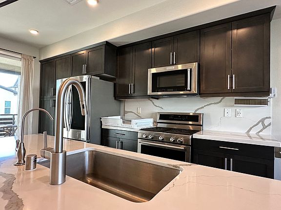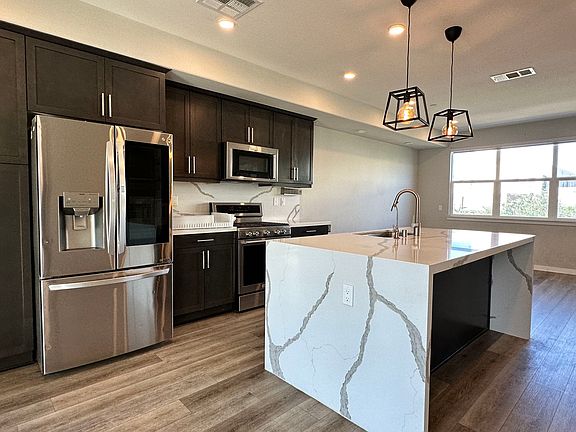 Community poolIsland with waterfall countertopRich cabinetsBarbecue areaBonus large denSpacious and airy kitchen