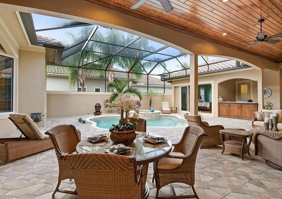 STUNNING! NEWER BUILT (2013) DESIGNER FINISHED "COURTYARD" HOME W/OVER $300,000+ UPGRADES BY BUILDER/OWNER. THIS 3BED, DEN, 3 BTH, POOL HOME IS ONE-OF-KIND! MASSIVE CUSTOM WROUGHT IRON DOUBLE DOOR ENTR (OVER $12,000), EXPANSIVE COURTYARD, SALT-WATER HEATED POOL, GUEST CABANA SUITE, SUMMER KITCHEN. HOUSE FEATURES TRAVERTINE MARBLE FLOORS. CEILINGS DOUBLE TRAY 14' W/CROWN MOLDING, COIFFURED & BACK-LIT. ALL IMPACT STORM WINDOWS & 10' SLIDERS MAKE HOME LIGHT & BRIGHT. CHEF'S KITCHEN (ALMOST $100,000+/-) STAINLESS STEEL APPLIANCES, INCLUDING 5 BURNER GAS COOKTOP, DOUBLE CONVECTION OVEN & MICROWAVE, CENTER ISLAND, ALL LEVEL 5 GRANITE TOPS. OPEN FAMILY ROOM W/ CUSTOM BUILT-IN WET BAR & WINE STORAGE. ALL WINDOWS HAVE DESIGNER WOOD PLANTATION SHUTTERS. MASTER BEDROOM HAS 14' TRAY CEILING, HIS/HERS WALK-IN CLOSETS & SITTING AREA, DUAL MARBLE SINKS, SOAKING TUB, WALK-IN SHOWER. THIS HOME IS DESIGNED FOR UPSCALE LIVING & ENTERTAINING. OPTIONAL SOCIAL & GOLF MEMBERSHIPS AVAILABLE. RENAISSANCE IS A WORLD CLASS GOLF & COUNTRY CLUB COMMUNITY. CENTER OF TOWN LOCATION, CLOSE TO SHOPPING, SCHOOLS, HOSPITALS, RESTAURANTS, AND 10 MIN TO SWFL INTERNATIONAL AIRPORT. HOME COMES W/ ONE-YEAR HOME WARRANTY.