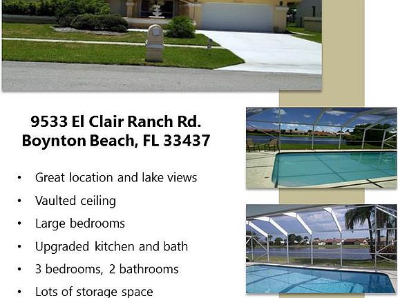 This 2302 square foot single family home has 3 bedrooms and 2.0 bathrooms. This home is located at 9533 El Clair Ranch Rd, Boynton Beach, FL 33437.