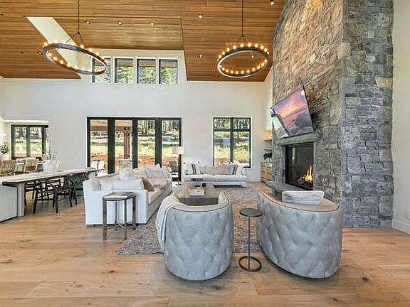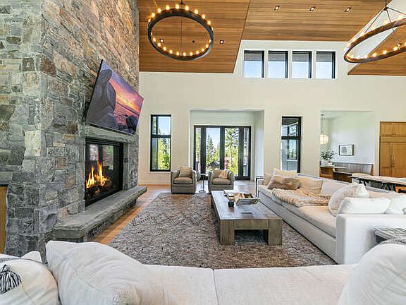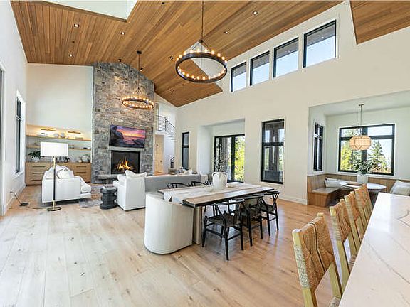The great room is the heart of the home, where vaulted ceilings, expansive windows, and a dramatic floor-to-ceiling stone fireplace create an inviting space for gathering. Oversized sofas, designer lighting, and a 75" flat-screen TV add both comfort and style ideal for cozy evenings after skiing or hiking.