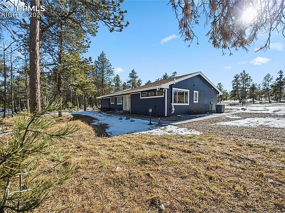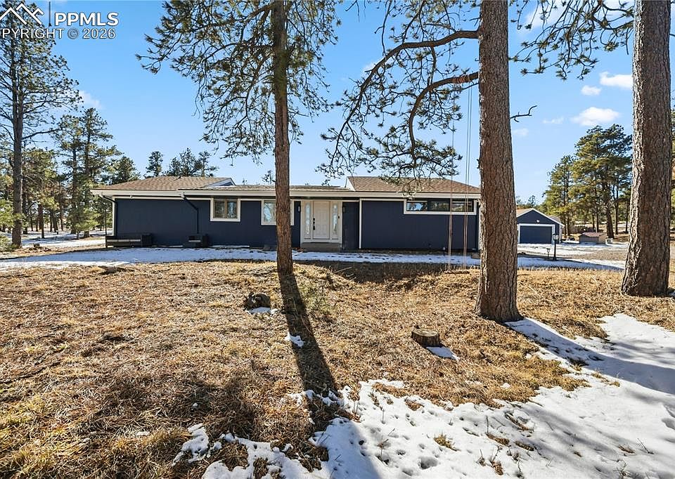 Discover the perfect blend of privacy, space, and convenience in this air-conditioned six-bedroom, four-bath ranch-style home set on five fully fenced, manicured acres with towering old-growth Ponderosa pines in sought-after southern Black Forest. Enjoy peaceful rural living just minutes from schools, shopping, and popular trails at Section 16 and The Pineries, all within award-winning District 20. This home has undergone a comprehensive high-end remodel and major system upgrades, offering true turnkey living. Custom front doors open to a stunning great room with vaulted ceilings, transom windows, and a wall of glass that fills the space with natural light. Fresh interior paint, white window frames, new trim, and modern interior doors with black hardware elevate the home throughout. The fully remodeled kitchen features upgraded appliances, generous counter and cabinet space, a cozy sitting area, main-level laundry, and access to a composite deck ideal for entertaining. The thoughtfully designed floorplan offers exceptional main-level living, with the primary suite privately separated from three additional bedrooms, office, and flex space. The luxury primary bath includes a rain shower with full glass enclosure and coordinated finishes with the guest bath. The finished basement adds two bedrooms, a full bath, family room, kitchenette/bar, and bonus office or craft room with glass French doors. Exterior upgrades include full repaint, stamped concrete patio, new driveway and sidewalks, and an oversized extra-deep detached two-car garage with workshop space. Major improvements include an 80-gallon hybrid water heater, Culligan whole-home water filtration system, advanced security system, remote-controlled blinds, new flooring throughout, and durable cement siding. With no HOA and expired covenants, this serene retreat offers elegant rural living with easy access to Colorado Springs and Denver.