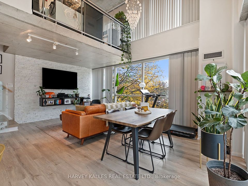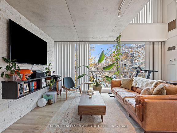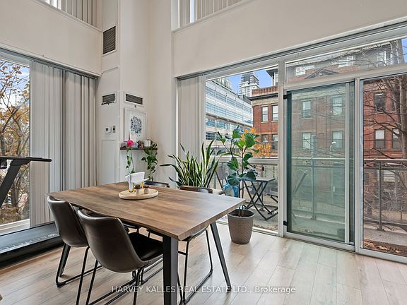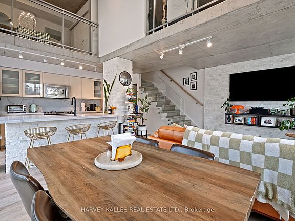 Rarely offered, this corner suite at King West Village Lofts is a sun filled two-bedroom, two-bath, two-storey condo that delivers a truly elevated living experience. Spanning a generous footprint, it showcases dramatic 18 foot plus ceilings, floor-to-ceiling windows, exposed concrete details, natural limestone accent walls and a series of thoughtful upgrades, including newly renovated stairs with a glass railing, new Caesarstone kitchen countertops, newly renovated bathrooms, updated light fixtures in both bedrooms and new flooring on the main level. The spacious, upgraded kitchen features full size stainless steel appliances, ample storage and a functional island perfect for effortless entertaining while the oversized southeast facing balcony extends your living space outdoors for morning coffees or relaxed evenings. The primary bedroom retreat includes a beautifully updated bathroom and a full wall of closets, and the expansive second bedroom easily adapts to guests, family or a generous home office, with every detail curated for comfort, functionality and style. This corner suite offers one parking space, one locker and an impressive amount of in-suite storage, with maintenance fees covering everything except cable. Perfectly situated near grocery stores, coffee shops, retail shops and restaurants, the condo is steps from the best of King West, Queen West, Trinity Bellwoods, Ossington, Parkdale and the waterfront, and minutes to transit, Billy Bishop Airport, Martin Goodman Trail, Budweiser Stage, BMO Field and easy highway access, providing an exceptional and truly turnkey urban loft lifestyle.