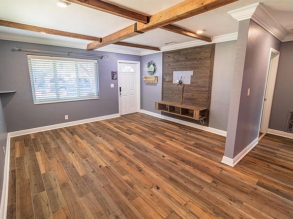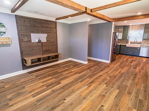 Stylishly Remodeled Gem in West Palm Beach!This beautifully upgraded 3-bedroom, 1-bath home perfectly combines modern finishes with warm Florida charm. From the moment you arrive, you're greeted by a lush front yard, mature shade trees, and a welcoming covered patio--ideal for relaxing in the evening breeze. Step inside to find an open-concept living area with exposed wood beams, crown molding, recessed lighting, and luxury wood-look tile flooring throughout.The custom kitchen is a showstopper with glossy European cabinetry, quartz countertops, a farmhouse sink, stainless-steel appliances, and a stunning glass mosaic backsplash. Enjoy meals in the cozy dining nook featuring a handcrafted wood table and built-in bench under a rustic chandelier. All bedrooms are bright, with modern paint tones and updated fixtures, while the spa-inspired bathroom boasts a glass-enclosed shower with rainfall head, designer tile, and vessel sink vanity. The home also includes impact windows, a newer A/C, and a dedicated laundry/storage room with washer and dryer.