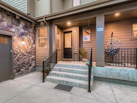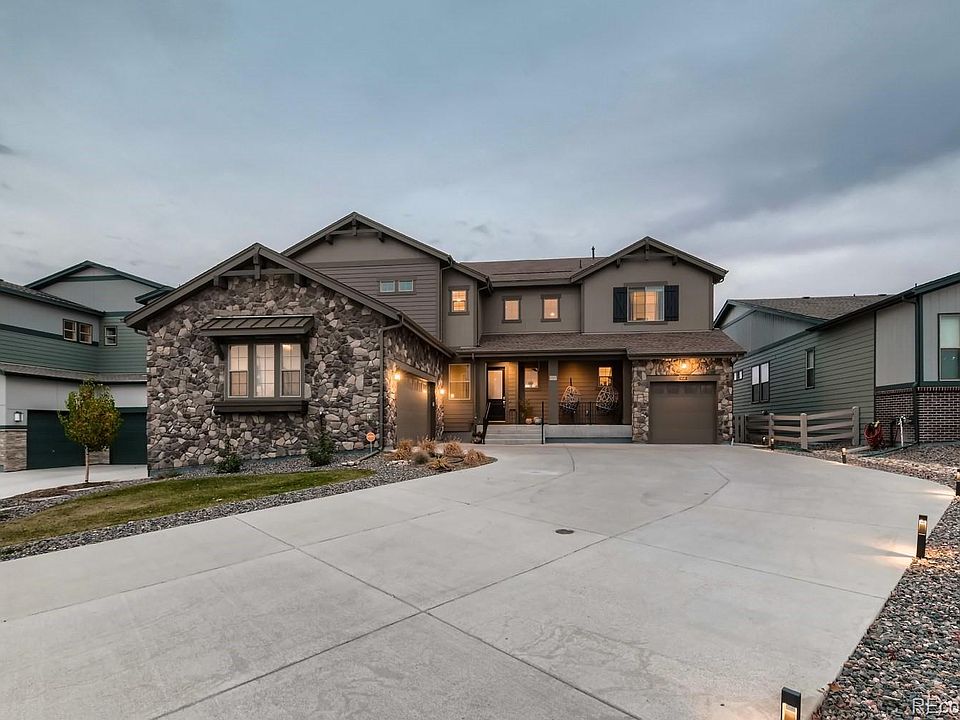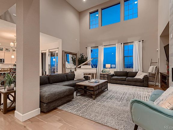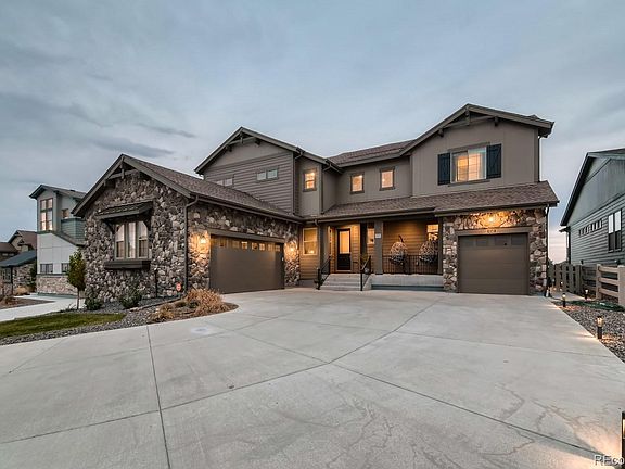 Stunning CalAtlantic 2-story home, truly the premium lot of the neighborhood! An awesome oversized stretch driveway leads you to a double and single-car garage. Total parking driveway and garage can accommodate at least 8 - 9 cars. The garage entry opens into a very large mud room off the kitchen.  A 4bdrm / 5 bath home with a main floor office and a very open floor plan, vaulted ceiling, prodigious 8-ft doors throughout, smart lighting, a smart home hub, and a whole house water filtration system.  The kitchen features both family dining as well as bar seating at a designer quartz island, features Kohler farm sink & faucet, and double ovens, all stainless steel appliances.  Spacious office, ensuite bedroom, and full bath are on the main floor.  The second floor features a generous walkway that separates a spacious primary suite from the other two bedrooms. The primary suite offers beautiful sunrises, a coffered ceiling, a small sitting area, 5 piece bath, and a professionally built custom grand walk-in closet.  Bedrooms on the second floor are all spacious with large windows, and great lighting.  The second floor features a large laundry room with ample counter space, cabinets, and a utility sink.   Entertainers' delight, the backyard is professionally landscaped, has an invisible fence installed, and provides gorgeous easterly views, a large sprinklered yard, an expansive deck with room for multiple seating areas as well as a custom stone firepit and seating area.  Covered front porch with beautiful mountain views. Abundant trails and a small park and playground are within walking distance.  This lot is west facing with mountain/sunset views from the front porch and beautiful colorful sunrises from the east await you from the back deck. Sterling Ranch community offers a clubhouse, fitness center, and a pool.  This community is within walking distance of hiking and biking trails, near Chatfield Reservoir, shops, and restaurants.