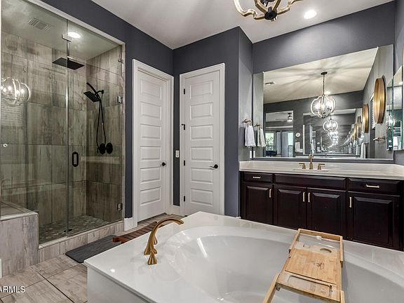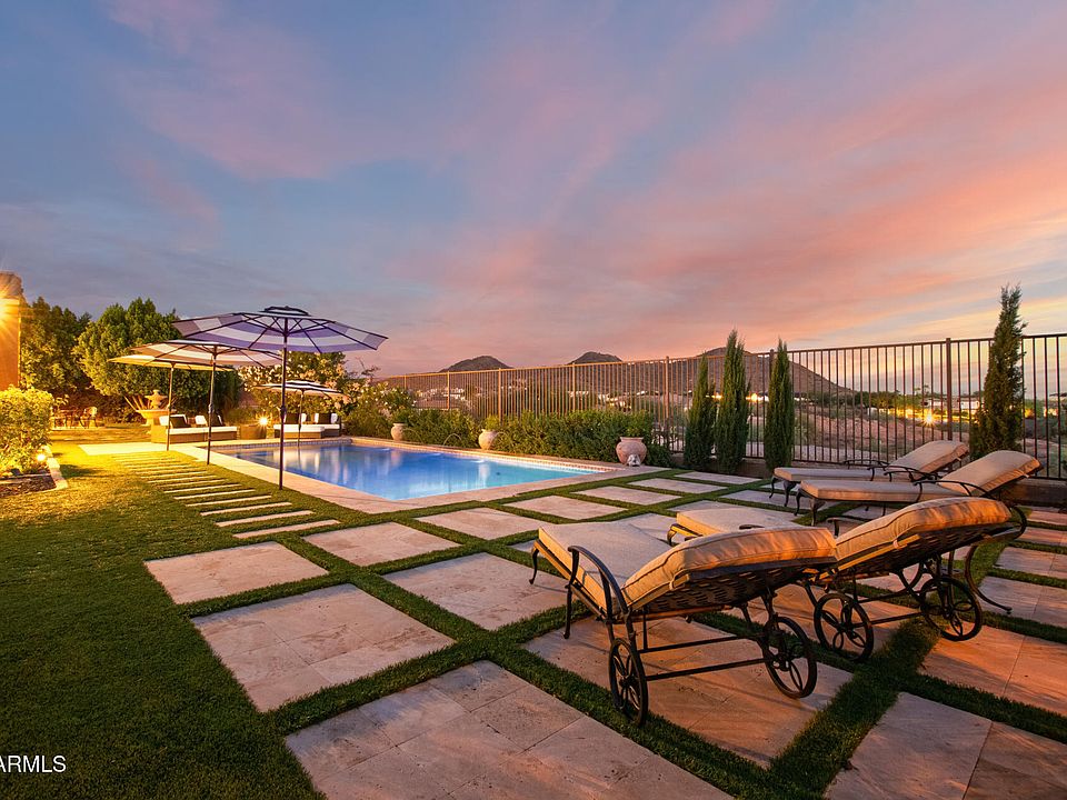 Stunning home in gated Querencia! Set on one of the largest lots with breathtaking mountain & city light views, this 3,898 sq. ft. home features 4 beds, 3.5 baths & 5-car garage. Enjoy an open floor plan with 12-ft ceilings, hardwood floors, a custom grand fireplace in the living room, a dedicated office, a den/theater room, and a chef's kitchen with top-tier finishes. The lush backyard features a sparkling pool, fountains, travertine tile, and a double-sided fireplace with ample space for entertaining. The luxurious primary suite offers a spa bath, rain shower & large walk-in closet. Complete privacy, surround sound throughout, and close to BASIS schools, shops, dining & Hwy 303.