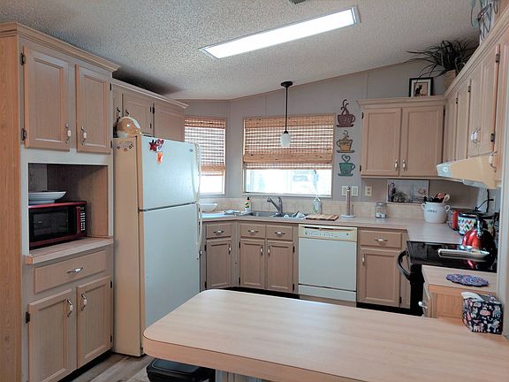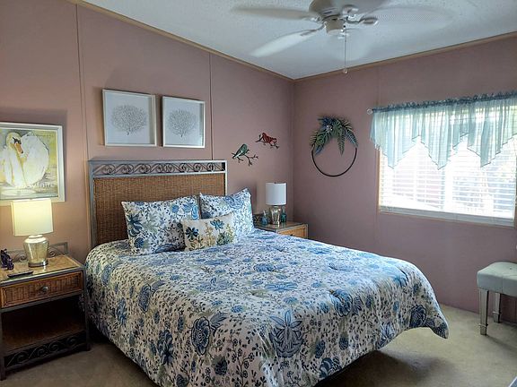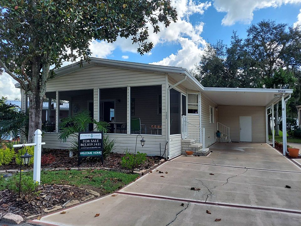 1990 Palm Harbor freshly painted 2 bedroom 2 bath home with 1222 square feet of living space for sale. There is new laminate flooring in living room, dining room and kitchen. The kitchen has a new stove, snack bar, & tile back splash and dining room hosts a large built in. Both bedrooms have carpeting, ceiling fans, and walk in closets. Guest bathroom has a tub/shower combo and the master bath having double vanities, walk in shower, and linen cabinetry. There is a separate laundry room with plenty of cabinet space that leads out to the carport, an extra large storage shed with workbenches & overhead lighting and a separate painted golf cart path along the driveway. This home hosts a lovely front view screened-in lanai shaded by a magnolia, a great way to start AND end the perfect day! The AC was replaced 2 years ago and roof is approximately 8-10 yrs old and the home is being sold partially furnished. Contact Cypress Lakes Sales & Information Center for more information and showing requests.