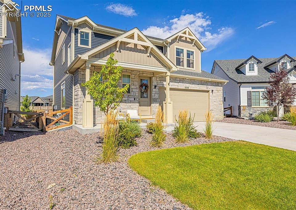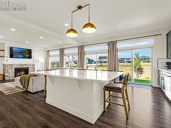 Welcome to this beautiful better than new model home featuring 3,298 total square feet of thoughtfully designed living space. From the inviting covered front porch to the tasteful stone-clad exterior, this home makes a lasting first impression with timeless curb appeal. Perfectly situated just off Woodmen Road and Banning Lewis Parkway, it offers both comfort and convenience with direct access to one of Colorado Springs’ most desirable master-planned communities. The open-concept main level showcases luxury vinyl plank flooring, oversized windows that fill the home with natural light, and a spacious living room that flows seamlessly into the dining area and gourmet kitchen. The chef’s kitchen boasts stainless steel appliances, custom cabinetry, quartz countertops, and a large center island—perfect for family gatherings and entertaining guests. Upstairs, the private primary suite provides a true retreat with a spa-inspired bath, dual sinks, and a walk-in closet. Two additional bedrooms, a full bathroom, a versatile loft space, and a conveniently located laundry room complete the upper level. On the main floor, a dedicated home office or playroom adds flexibility, while the unfinished basement offers room to grow. Step outside to enjoy a low-maintenance yard ideal for play, relaxation, or summer barbecues. Living in Banning Lewis Ranch means access to award-winning schools, acres of parks, miles of scenic trails, community pools, playgrounds, and a state-of-the-art recreation center. This home is move-in ready and designed with today’s modern family in mind, offering the perfect blend of style, function, and location. Hurry this home will not last long!