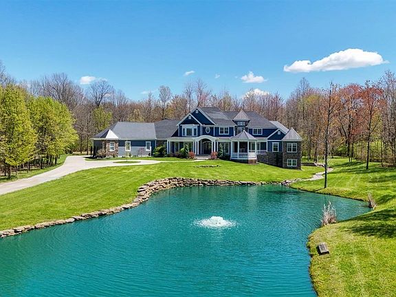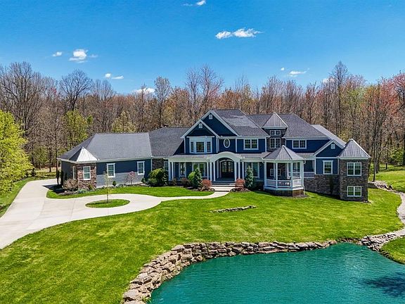 This impressive custom-built home spans 8225 square feet in a picturesque 3.8-acre setting with a fully stocked pond that feels like a country estate, yet in a super convenient location! Enjoy private views of the entire property from the grand front & rear covered porches. Chef's kitchen with walk-in pantry is open to the great room & den with fireplace. Huge 1stfloor laundry with pet wash. Expansive 1st floor primary suite wing features a private study, two walk-in closets, and an amazing spa bath. 2nd floor features 3 bedrooms, all with en-suite bathrooms attached. Walk-out LL features an indoor sport court with 23-foot-high ceiling, exercise room, 2ndbar/kitchen, theater rm, billiards, craft room, full bath, and ample storage! Fun continues with full-size golf simulator and relax in the 4-person sauna. Vacation at home year-round! No HOA.