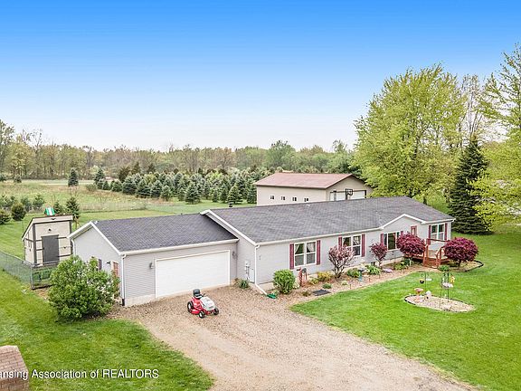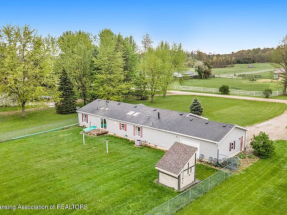 Welcome to over 2 acres in Dewitt for an amazing price with this 2300 sq ft, super spacious manufactured ranch. Big pretty kitchen with an island & large pantry (tons of storage) three bedrooms & 2 full bathrooms plus a flex room that is perfect for work at home space or could even be a fourth bedroom. Great primary bedroom with huge primary bath with double sinks plus vanity space. Magic heat reclaimer wood burning fireplace that heats the home beautifully utility bills are extremely minimal.Huge fenced in yard (1.5 of the 2.09 acres is fenced) so your property goes even beyond this. 55 inch mounted tv stays, as well as all appliances (3-4 years old) including washer/dryer. Attached 2 car garage with front and back doors & 220 sub panel ready for a pole barn. New 50 gallon water heater (1 yr) & newer water softener. St. Johns schools, right on border for Dewitt schools so could send the children there as well.