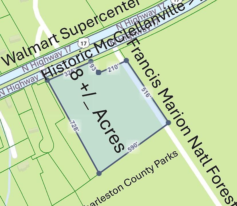Just under 8 acres with over 3 acres of highland. Discover the perfect canvas for your dream home or investment project! This remarkable property is nestled between the scenic Charleston County Parks and the beautiful Francis Marion Forest, offering both privacy and natural beauty.Enjoy the tranquility of living near vast green spaces, ideal for outdoor enthusiasts.Just minutes from the charming historical village of McClellanville and a nearby boat launch for easy access to water activities. A quick drive to Mount Pleasant and the Isle of Palms provides a blend of rural peace and urban convenience. This land is perfect for subdivision or as a private estate. An encroachment permit is already in hand, and boundary service is currently in process. Recently under brushed for easy access