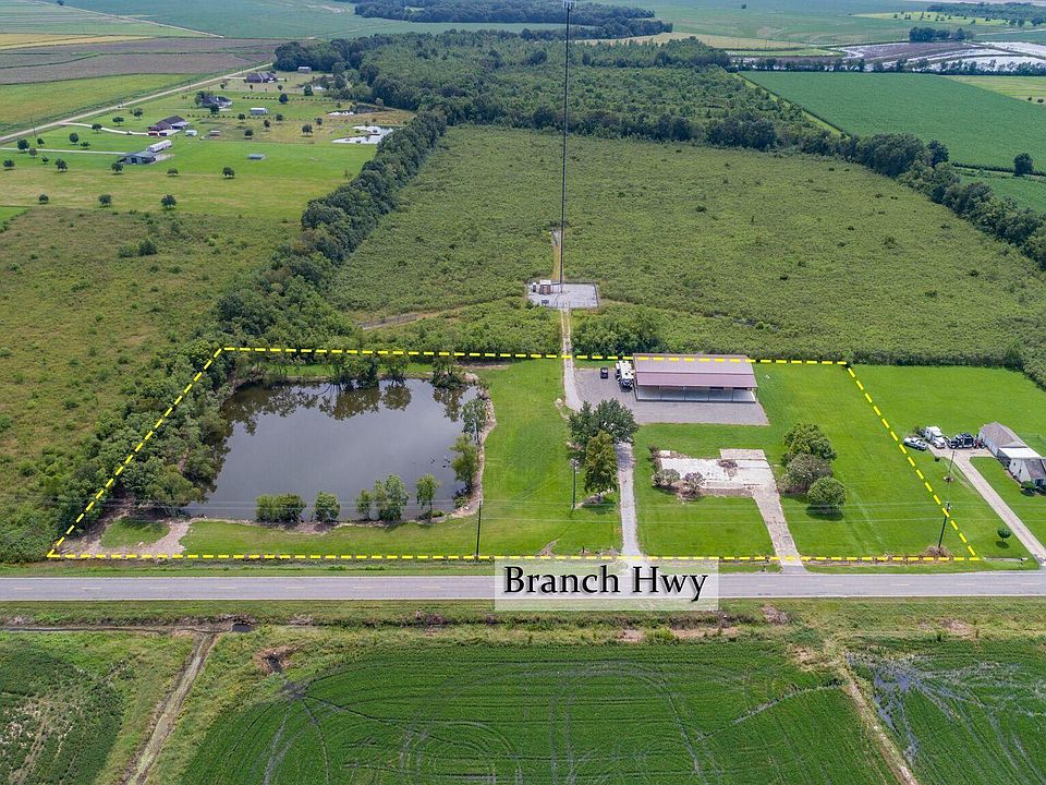For your total enjoyment comes this unique opportunity. Peaceful, relaxing, privacy... Beautiful acreage with a fully stocked pond, large metal building with wrap around porches and a concrete house pad ready for you to make into your paradise. This property is just minutes away from I-10 just off Branch Hwy. On the rear of the property, there is a new large metal building with 2 roll-up doors and loads of covered patio area, inside you will find open space ready to build out your dream home or private camp. The building has electricity, sewerage and water. This property sits high and dry and is NOT in a flood zone.