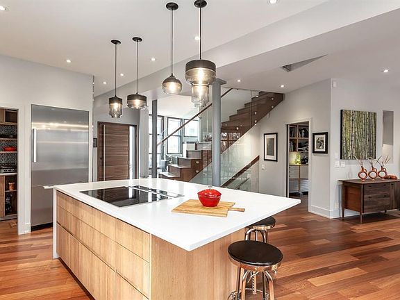Brazilian cherry hardwood floorsCentral glass staircasePorcelanosa kitchenFlooded with natural lightMiele appliance packageWood-burning fireplaceVaulted ceilings