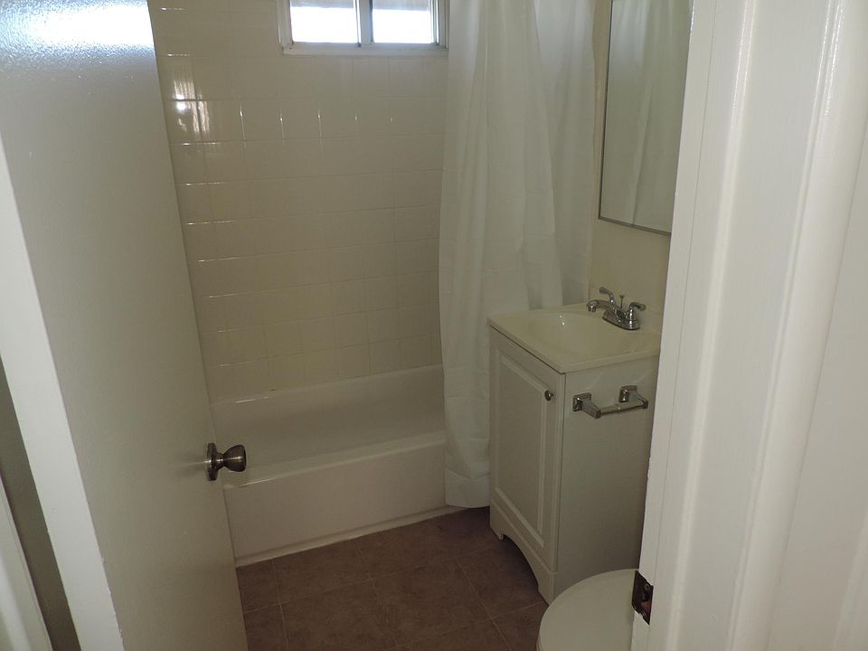 Small 1 bedroom/1 bath apartment, fresh;y painted, new ceramic tile and carpeted floors, vertical blinds, stove, refrigerator, garbage disposal, ceiling fan, security door. double pane windows, on site laundry, carport parking, no pets, 1 year lease, $1475.00 security deposit. Viewing 9-3 Monday-Saturday.